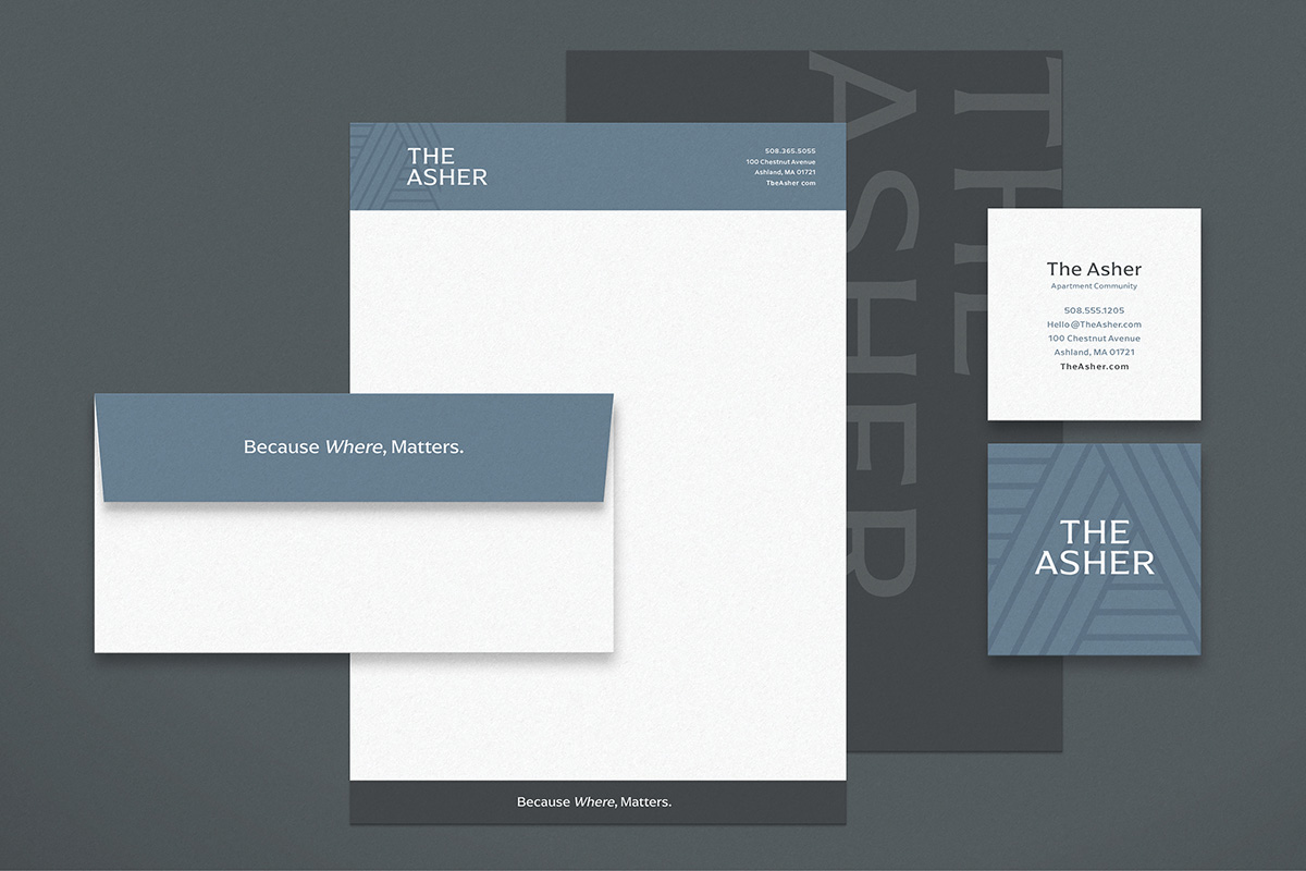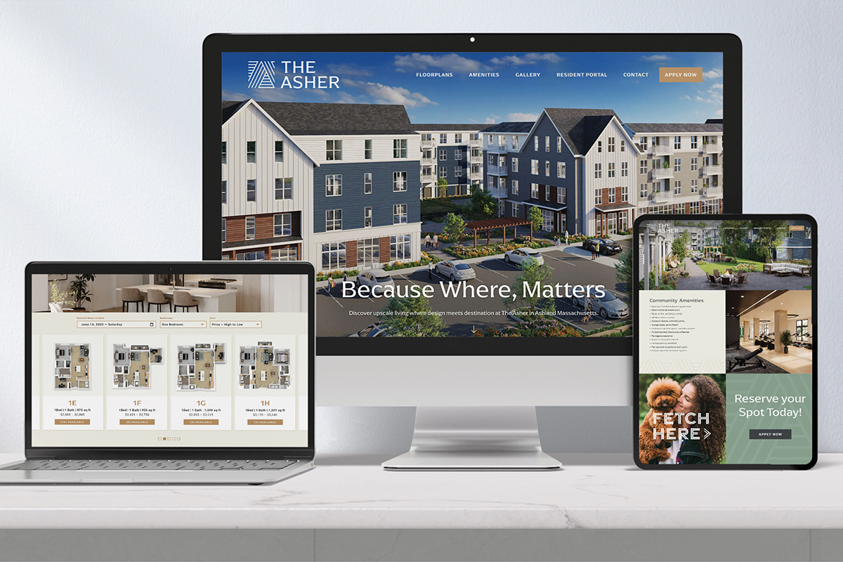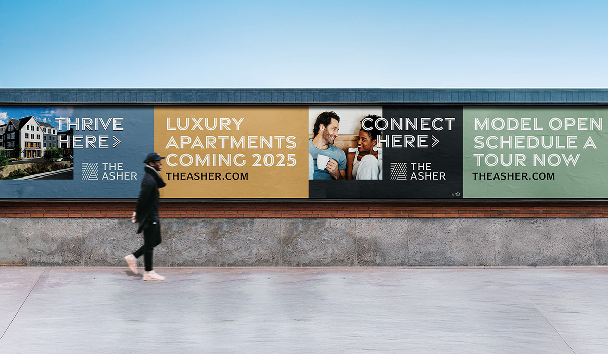 Tucked between trailheads and commuter lines, The Asher offers a new kind of living in Ashland, MA—where MetroWest energy meets the ease of a neighborhood retreat. Baystone Development brought us in early to create a full brand identity for their newest four-story, mixed-use community—one that feels both elevated and effortlessly welcoming. We began with a name that subtly nods to the town, then defined a brand personality that’s modern classic with a warm, approachable edge. Clean lines, inviting tones, and a balanced visual language reflect the calm vibrancy of the setting. We also crafted the anchor tagline, Because Where, Matters, and a flexible set of headlines—like Thrive Here—designed to help residents embrace both place and presence. The Asher is more than a new address—it’s a brand experience rooted in a deep sense of place, ready to welcome residence home to everything that matters.